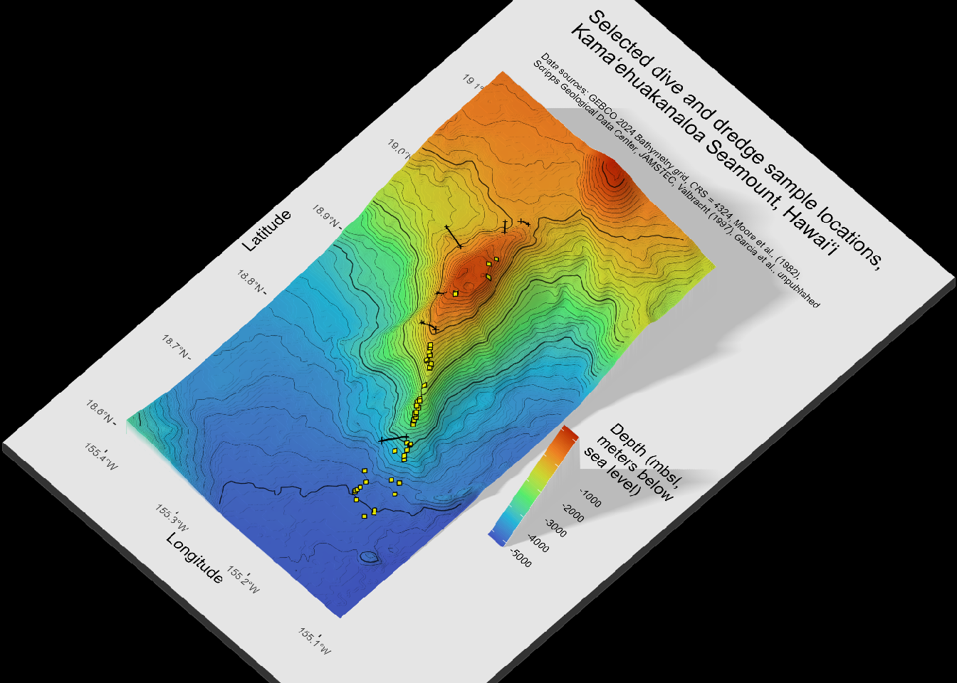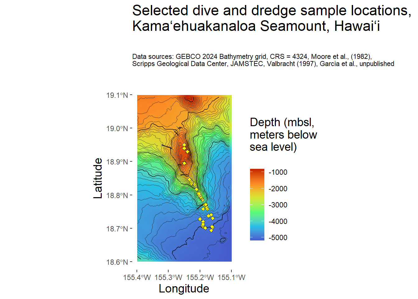 title = "Selected dive and dredge sample locations, \nKamaʻehuakanaloa Seamount, Hawaiʻi \n",